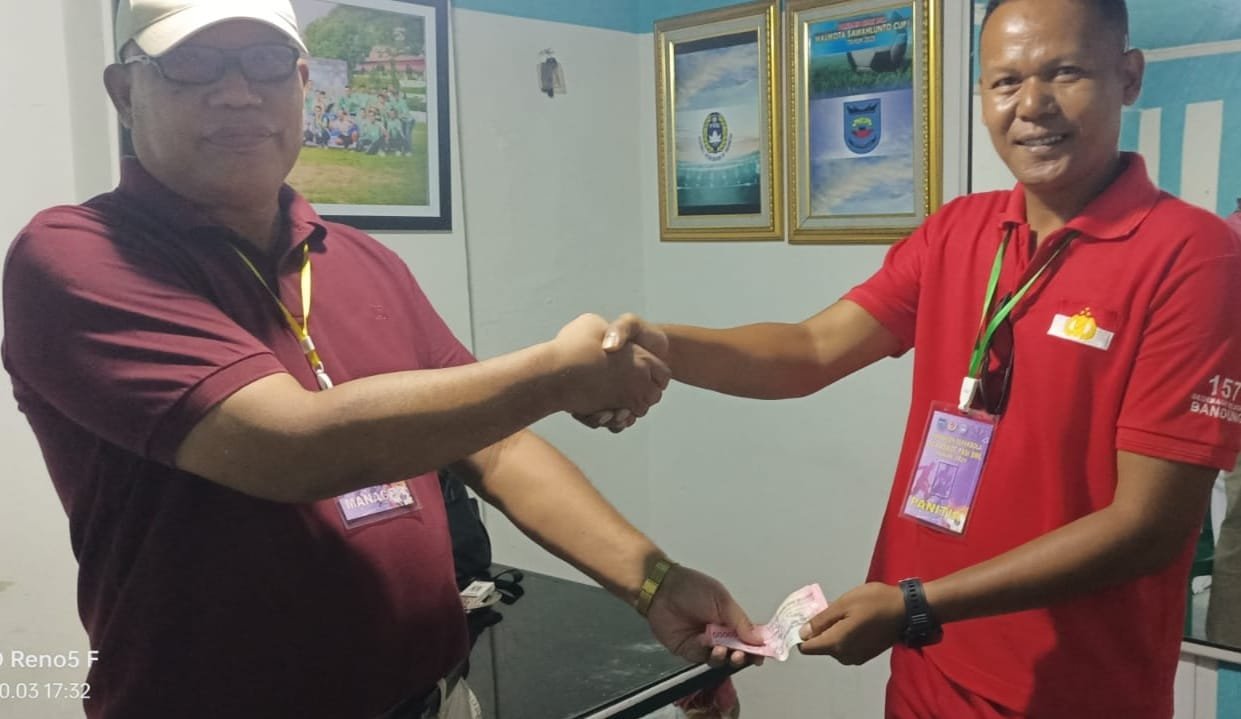 Ketua MKKS SMP Kota Sawahlunto Yulianto menyerahkan dana sebesar Rp500 ribu kepada panitia pelaksana Liga Askot PSSI Kota Sawahlunto dijedah pertandingan antara SMPN 1 Sawahlunto vs SMPN 2 Sawahlunto, Jum’at (3/10/2025) sore.