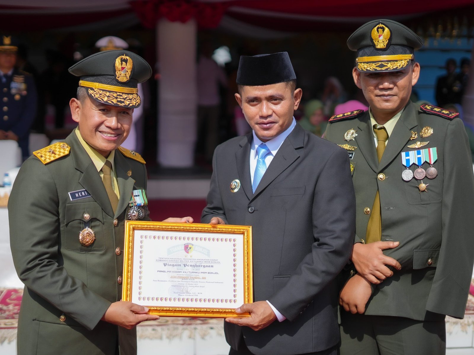 Padang, – Bupati Solok, Jon Firman Pandu, menerima penghargaan pada peringatan Hari Ulang Tahun (HUT) Tentara Nasional Indonesia (TNI) ke-80 yang digelar di Lapangan Imam Bonjol, Kota Padang, Minggu (05/10/2025).