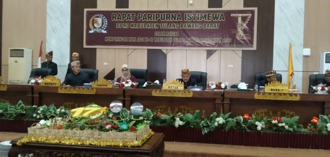 Dewan Perwakilan Rakyat Daerah (DPRD) Kabupaten Tulang Bawang Barat (Tubaba), Provinsi Lampung, menggelar rapat paripurna istimewa dalam rangka memperingati Hari Ulang Tahun (HUT) ke-17 Kabupaten Tubaba, Senin (6/4/2026).